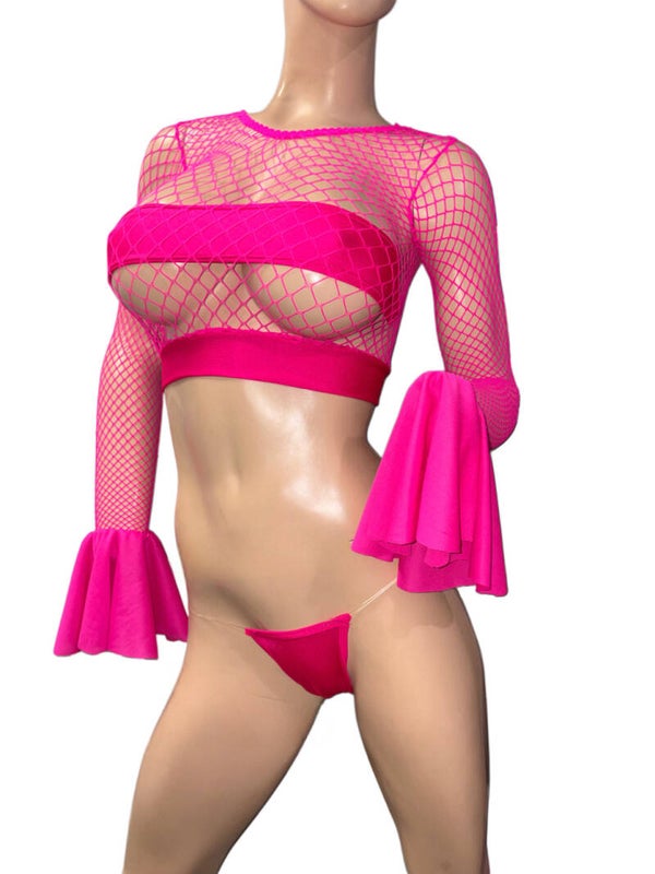 Sexy pink Net top long sleeve with tube top and thong size small medium