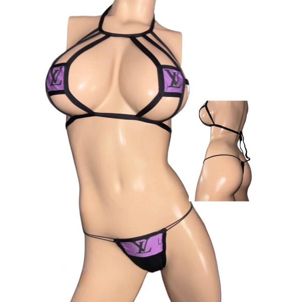 sexy cage top style with purple print and thong size small medium. Lycra spandex fabric