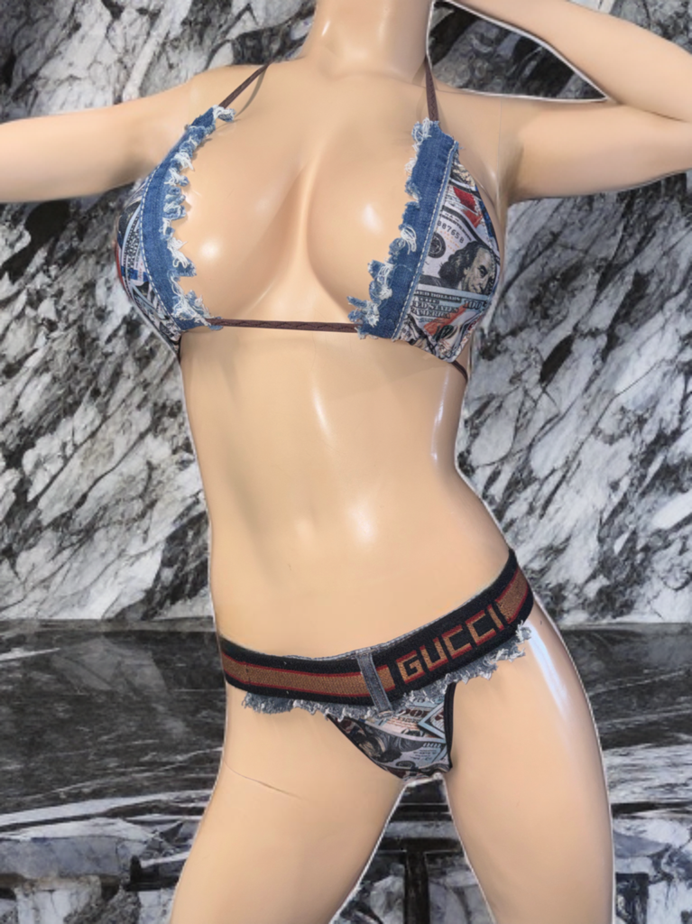 Sexy money print thong with jean band and top with money print in jean trim . Size medium. Lycra spandex fabric