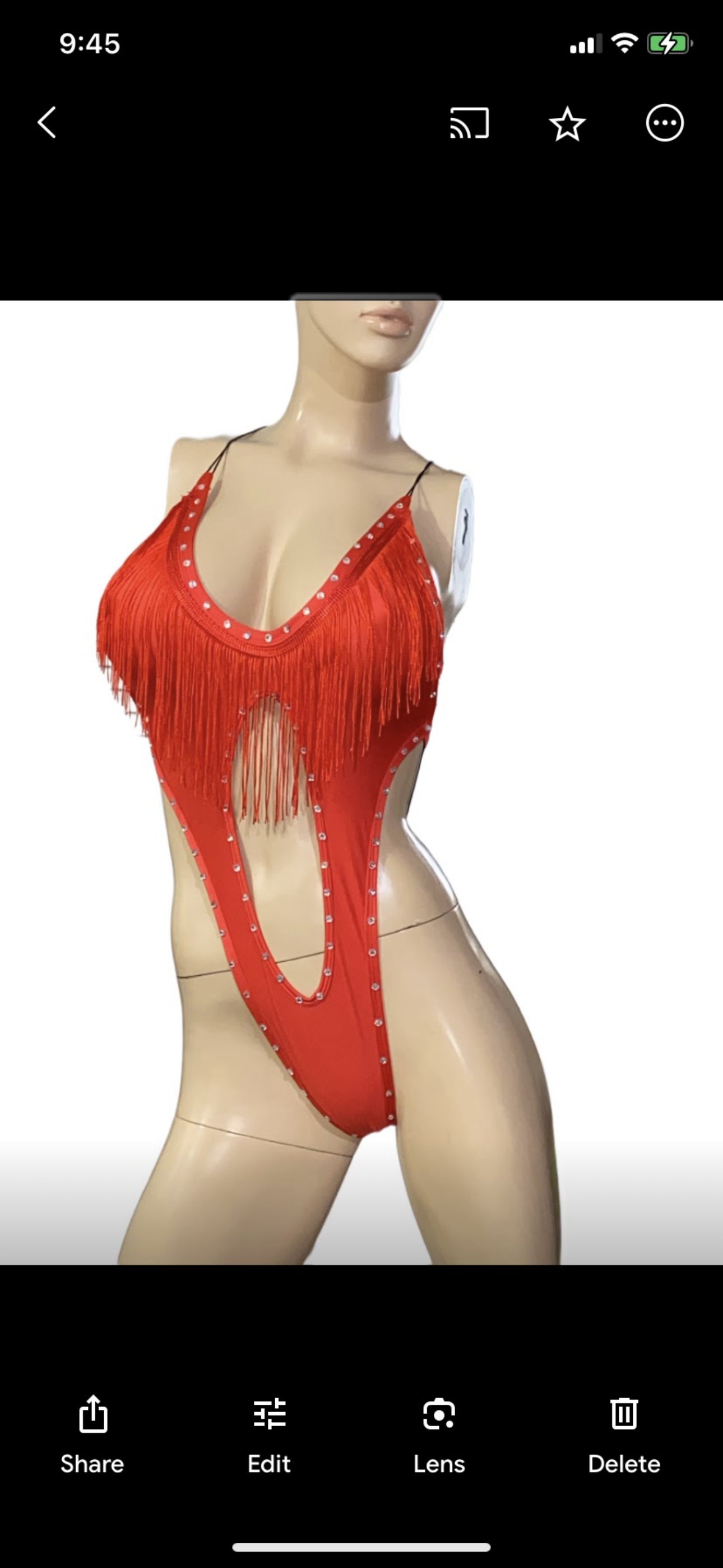 Sexy red fringe bodysuit with rhinestone . Size small medium. Lycra spandex fabric. Made in USA