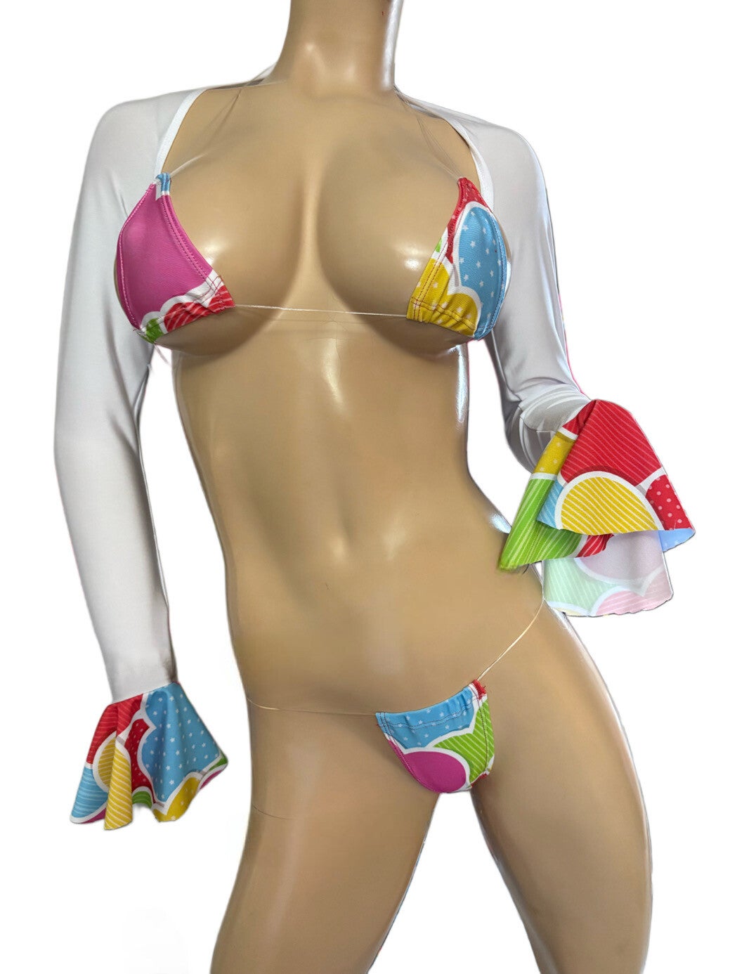Sexy neon prints colorful hearts print bikini with white sleeves arm with flair prints matching the bikini. Size small medium. Lycra spandex fabric